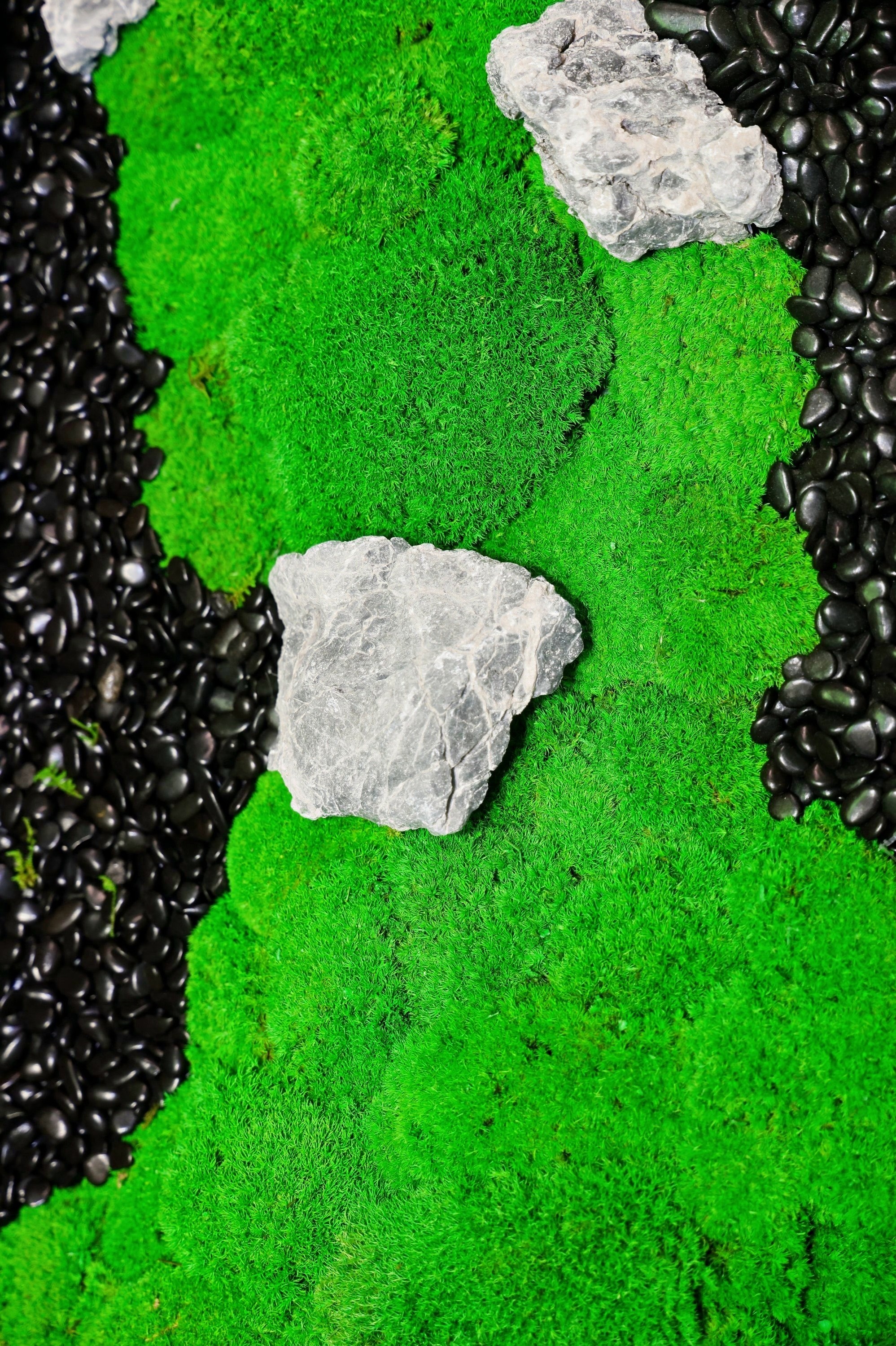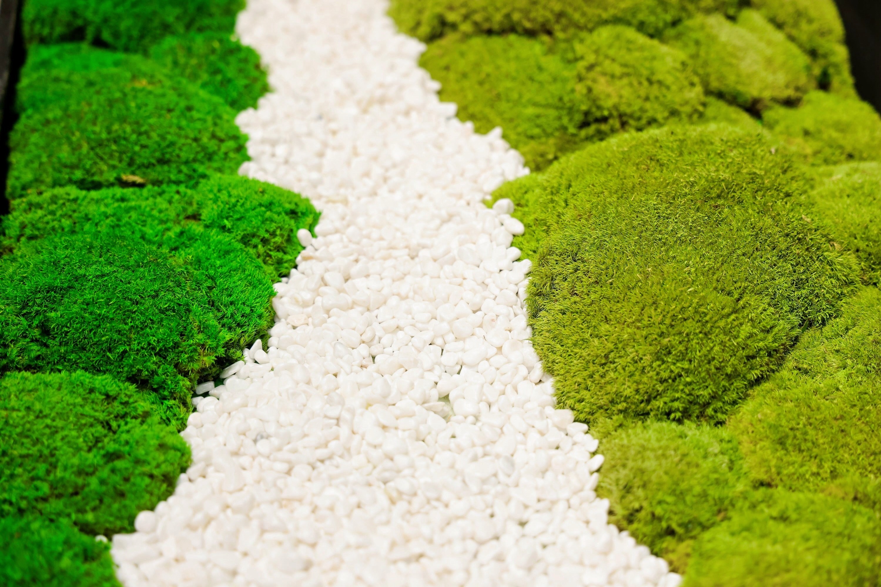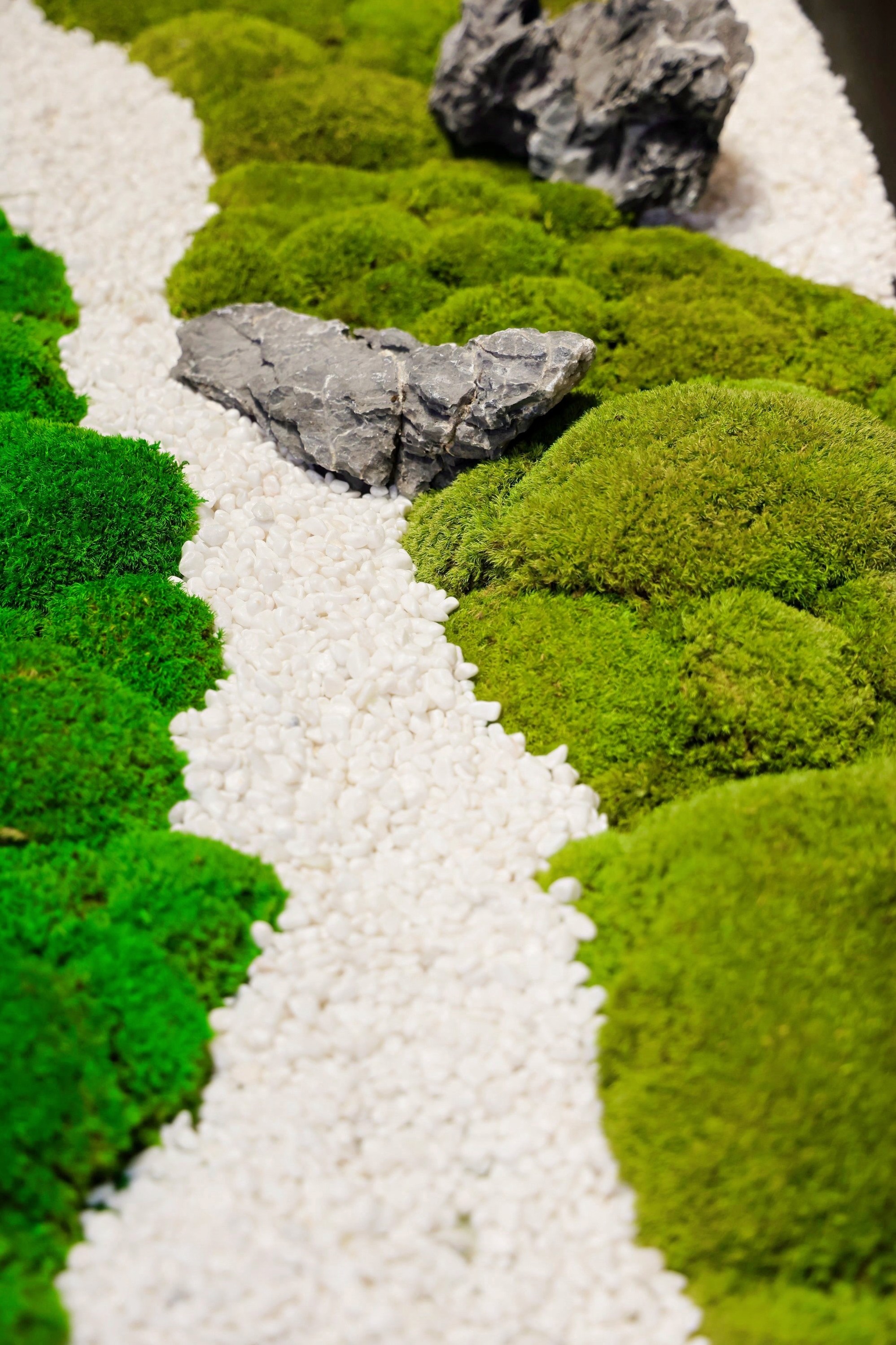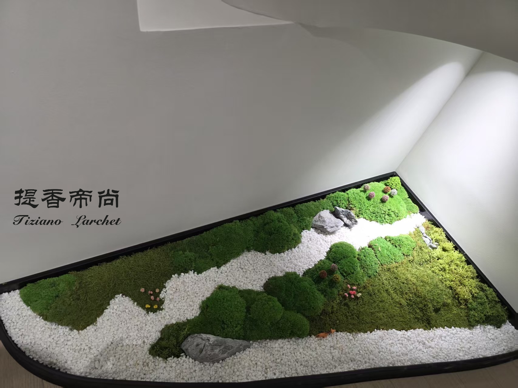 苔藓拼出云纹/波浪/漩涡造型,水洗鹅卵石缀其间。